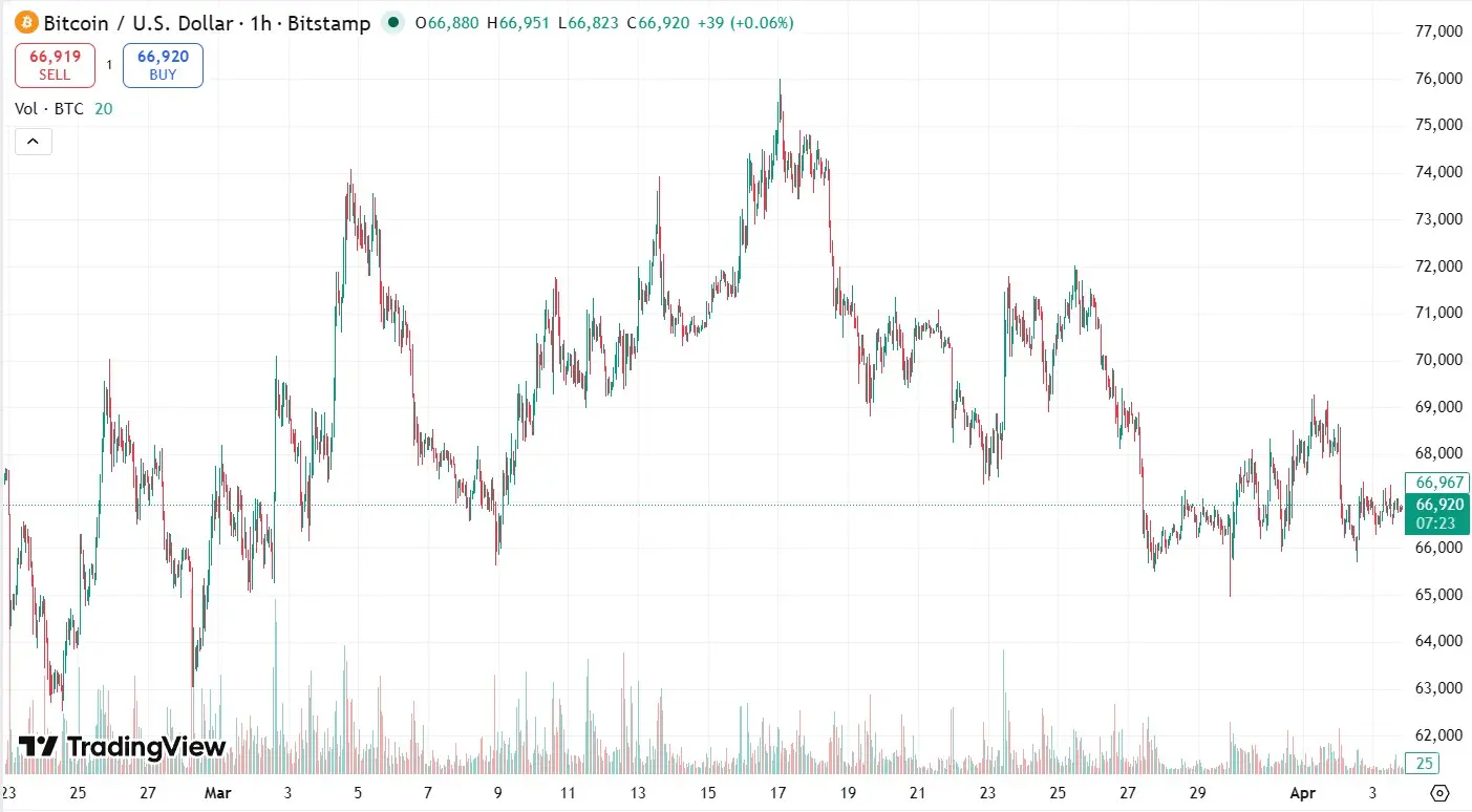 Cena BTC se po pokusu o růst nad 75 tisíc USD vrátila zpět k oblasti kolem 65 tisíc USD. Zdroj: TradingView