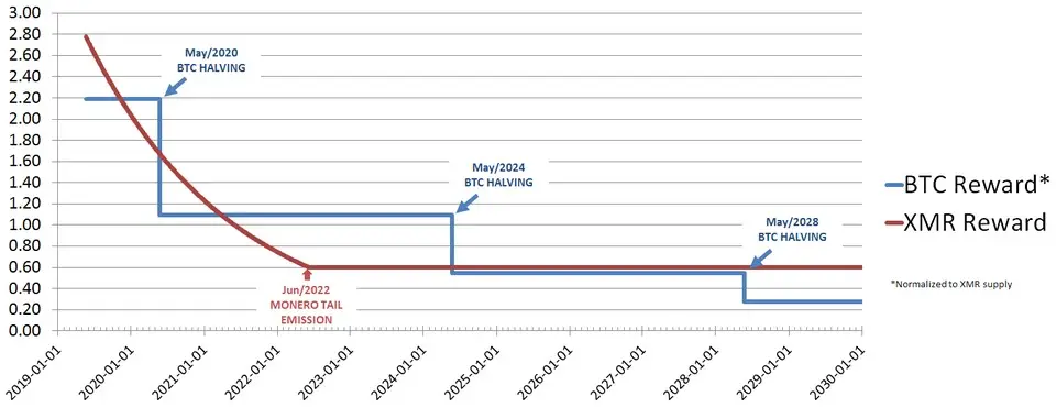 Po skončení hlavní emise Monero přešlo na tzv. „tail emission“. Od konce května 2022 se tak odměna udržuje na 0,6 XMR na dvouminutový blok (s možností penalizace podle velikosti bloku), aby bezpečnost sítě dlouhodobě nestála jen na poplatcích.