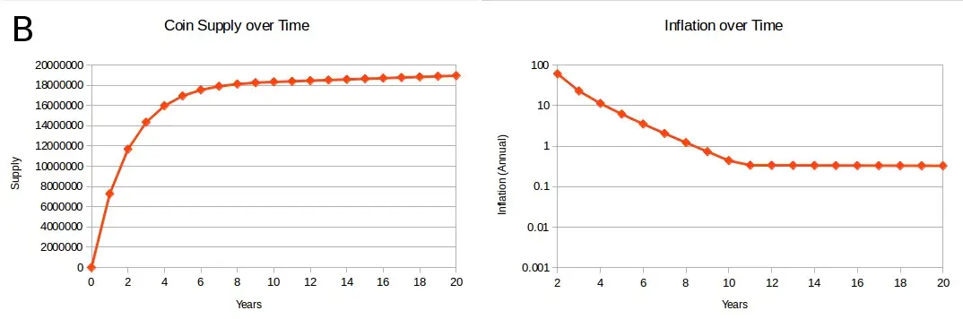 Porovnání momentální inflace BTC a XMR. Na grafu vidíme i další Bitcoin halving kolem května 2028.