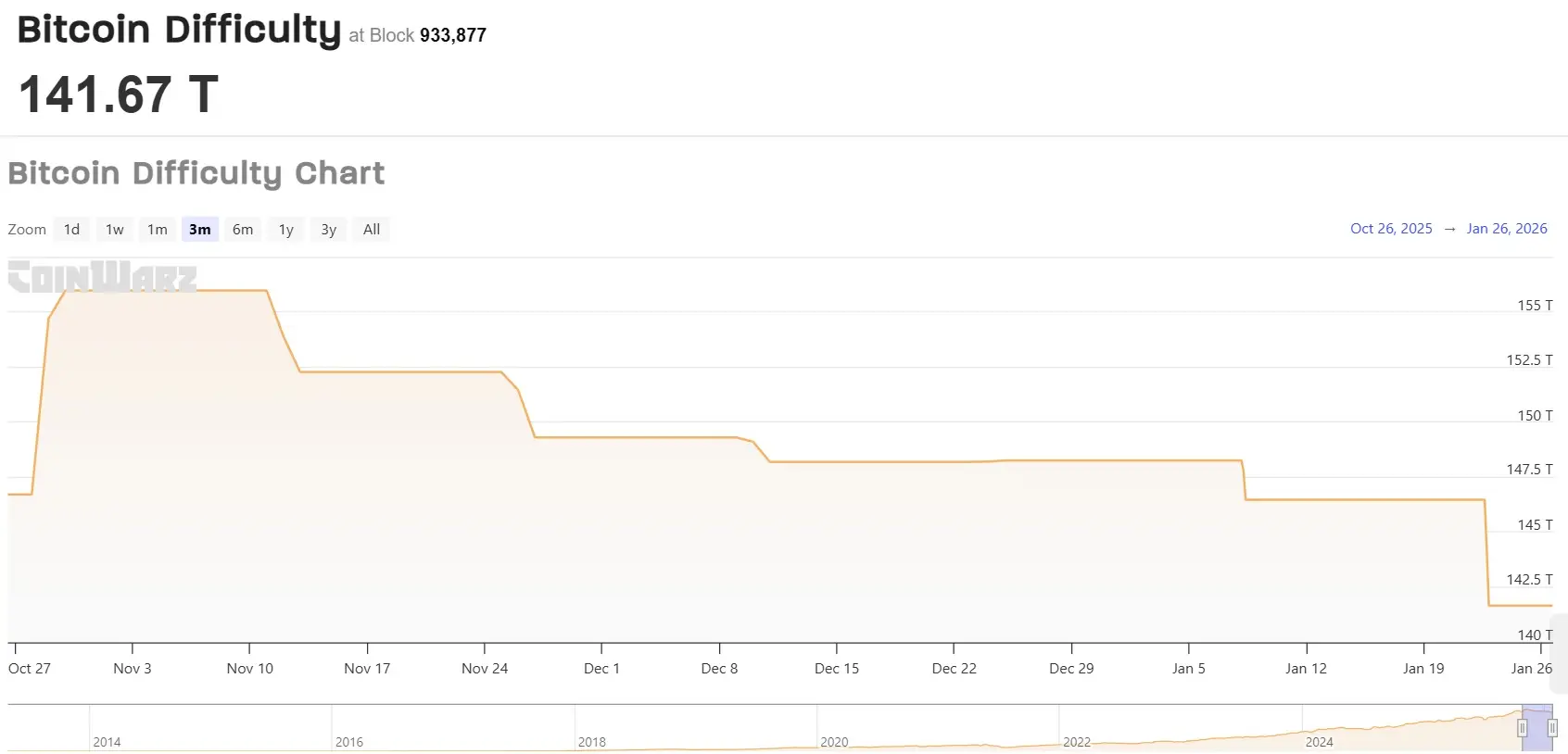 Sedmidenní průměr hashrate Bitcoinu se podle dostupných odhadů v druhé polovině ledna snížil na zhruba 992 EH/s, tedy asi o 13,7 % oproti historickému maximu nad 1,15 ZH/s z října. Poslední úprava obtížnosti (k 2. únoru) proběhla 24. ledna a přinesla pokles o 3,28 %, což je nejvýraznější pokles od poloviny října.