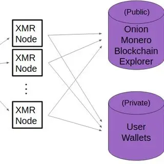 Schéma oddělení pohledu blockchainového prohlížeče a soukromých peněženek, které komunikují se sítí přes uzly Monera. Jeden by snadno čekal, že Monero prohlížeč nemá, ale není tomu tak. Absolutní soukromí neznamená, že na blockchainu nejsou data, která se nedají sledovat. Jen je prakticky nemožná konkrétní identifikace.
