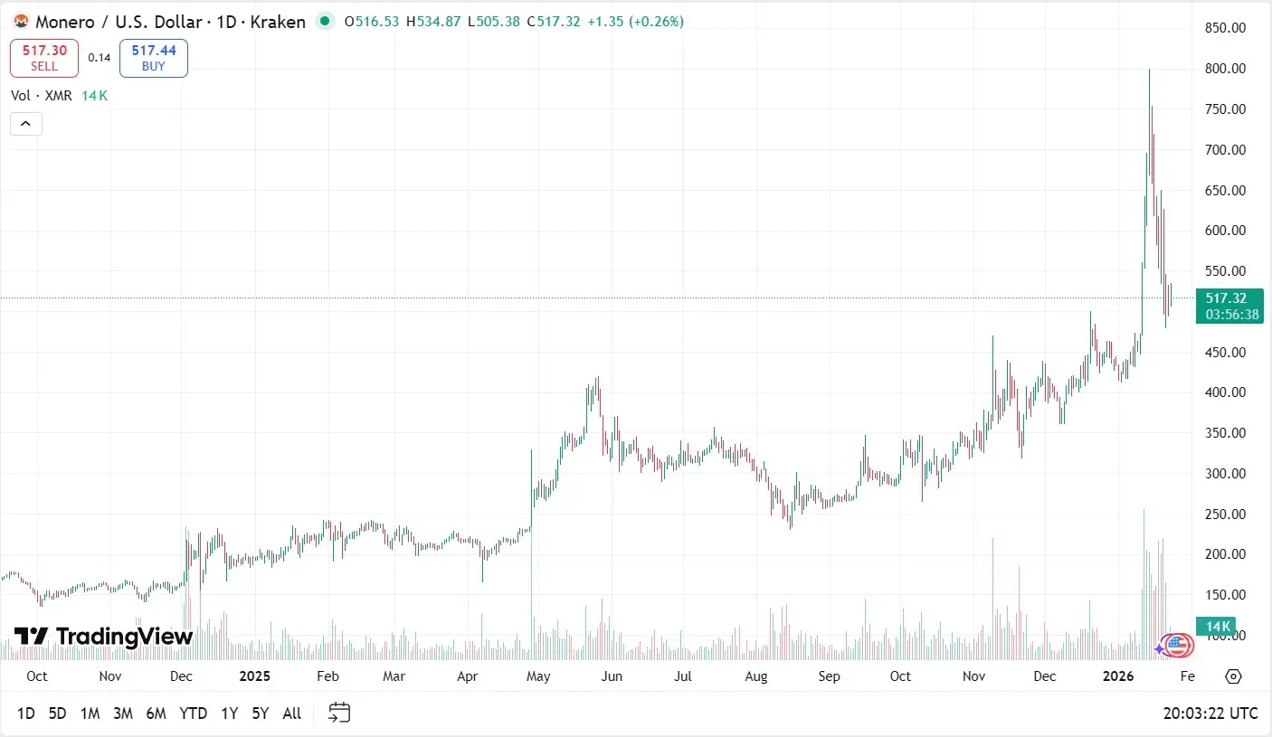 Cena Monero od konce roku 2024 roste. Zdroj: TradingView
