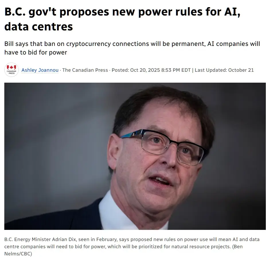 K podobnému závěru dospěla i kanadská provincie Britská Kolumbie, která připravuje trvalý zákaz připojování nových těžebních projektů na svou rozvodnou síť. Region tak reaguje na dlouhodobou zátěž infrastruktury a kolísání cen energií, jež podle místních úřadů vyvolává právě vysoká koncentrace těžařů. Politici musí reagovat i kvůli vysokým nákladům na život, které Kanadu (ostatně jako většinu západních států) sužují.