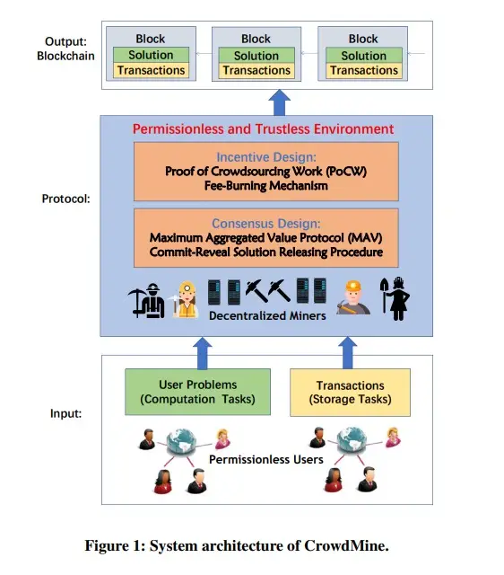 Zajímavé bude sledovat, zda se vývojářské komunity či nadace projektů pokusí protokoly přizpůsobit. Třeba tak, že část těžby bude sloužit i pro užitečné výpočetní úkoly, což se již dnes diskutuje. Za všechny lze zmínit akademický koncept CrowdMine z roku 2022. To by mohlo vyvolat tlak na nové modely decentralizace. Níže najdete systémovou architekturu konceptu.