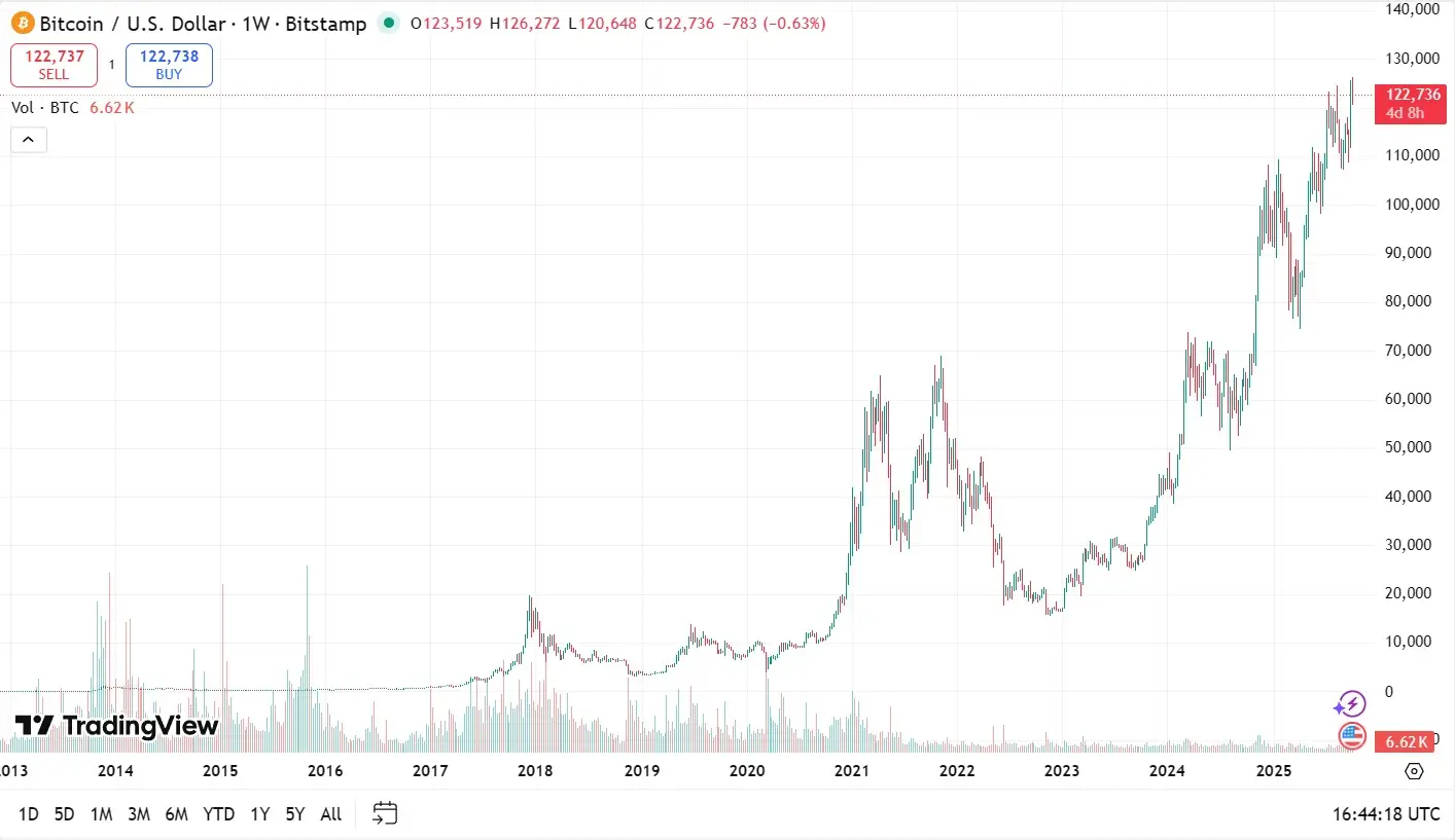 Právě růst ceny je důvod, proč se těžba stále vyplatí. I když se odměna za blok snižuje, hodnota samotného Bitcoinu obvykle v dlouhodobém horizontu roste rychleji. Po každém halvingu nastal dříve či později nový růstový cyklus, který je dobře čitelný na grafu níže.